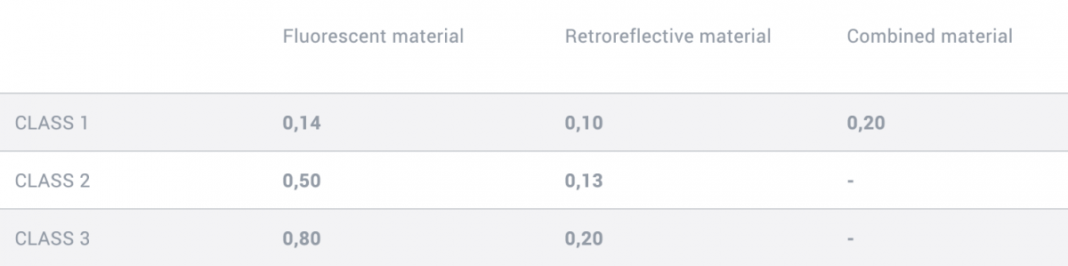 The minimum surface (in m2) required for the visible material is 0.14 of background material, 0.1 of retroreflective material and 0.2 of combined material. It is used for activities which allow the user to be seen completely and without any doubt by approaching vehicles. There must be sufficient distance between the worker and any traffic, the latter not exceeding speeds of 40km/h. (24.9mph)