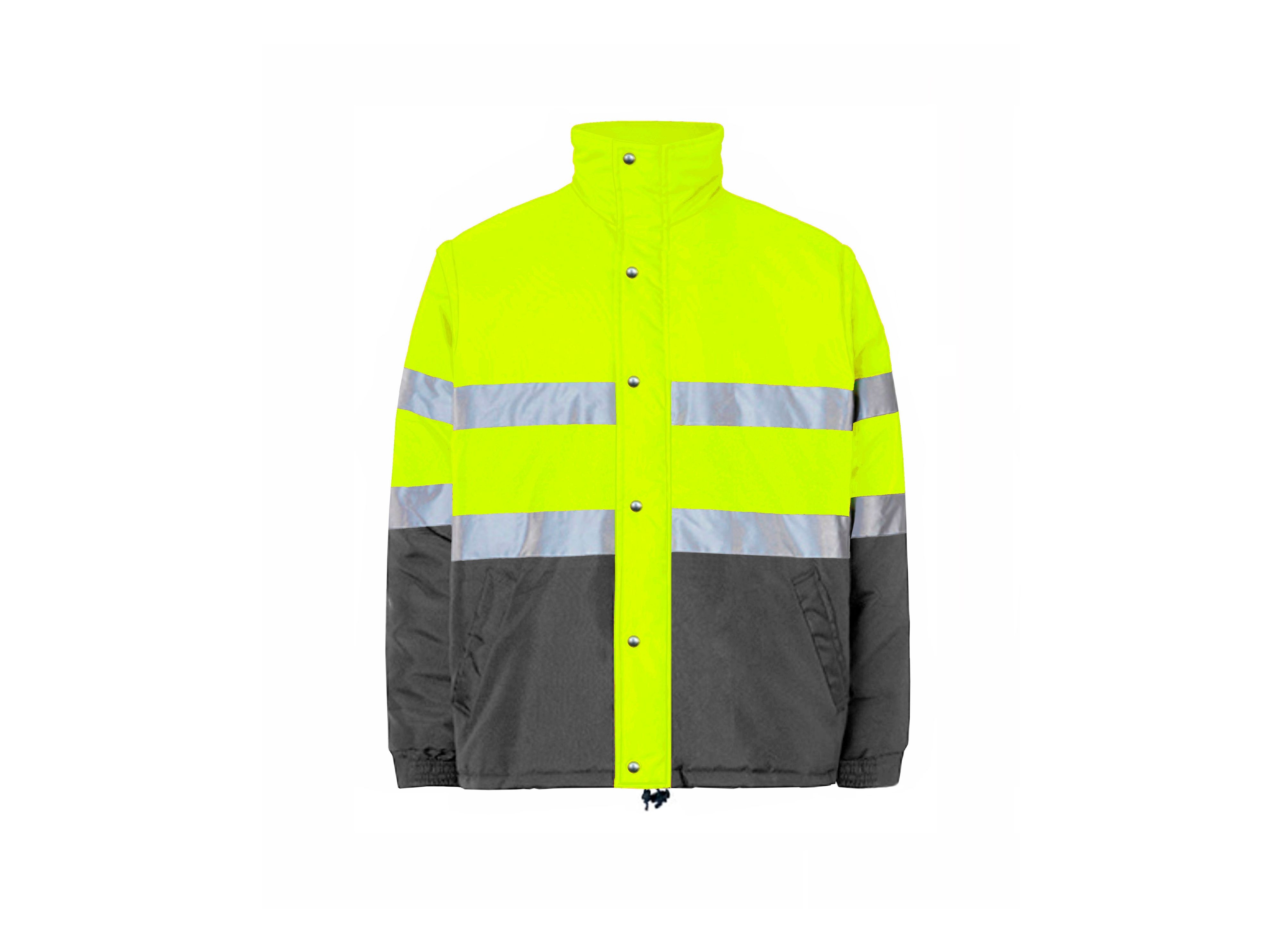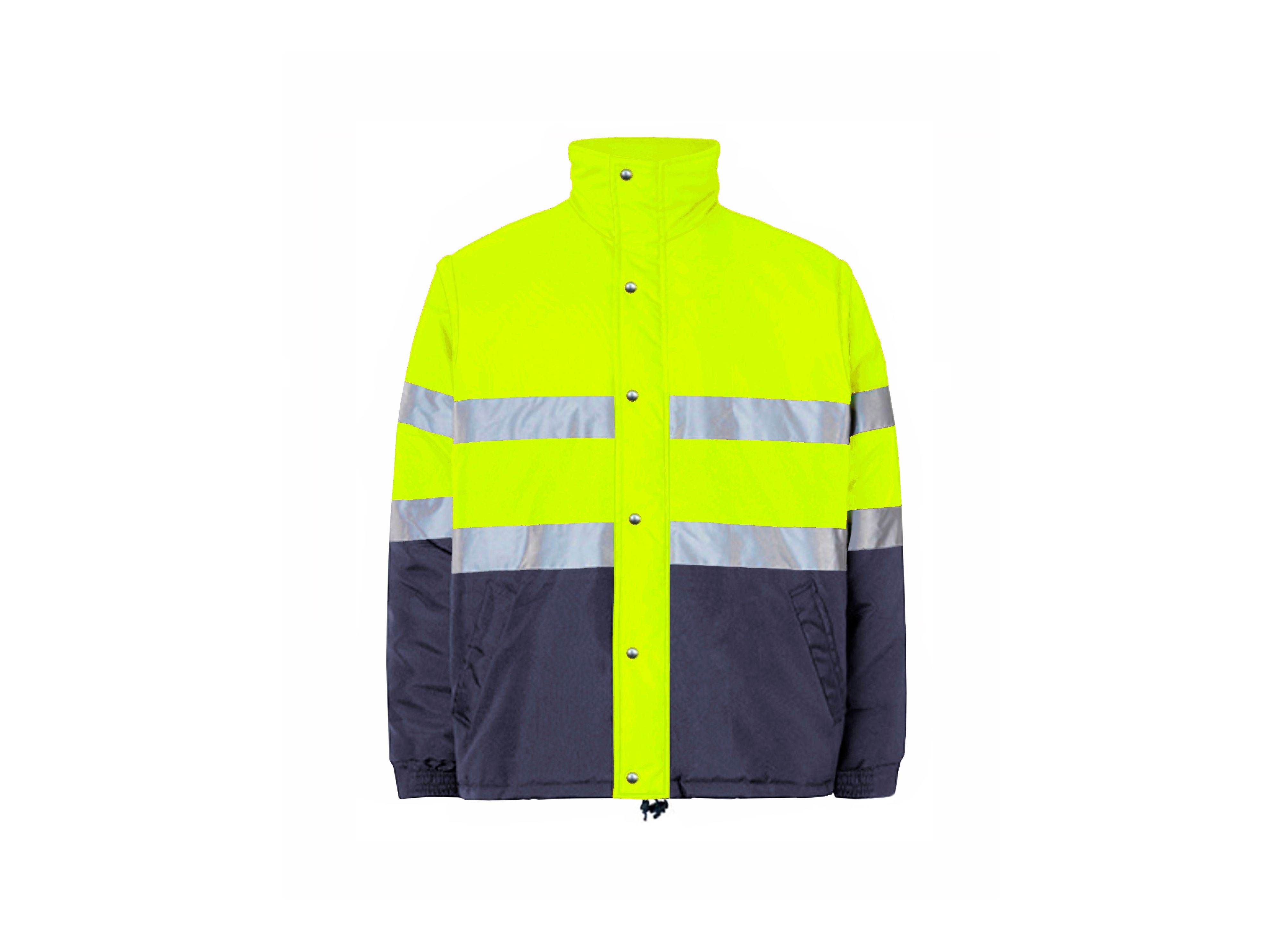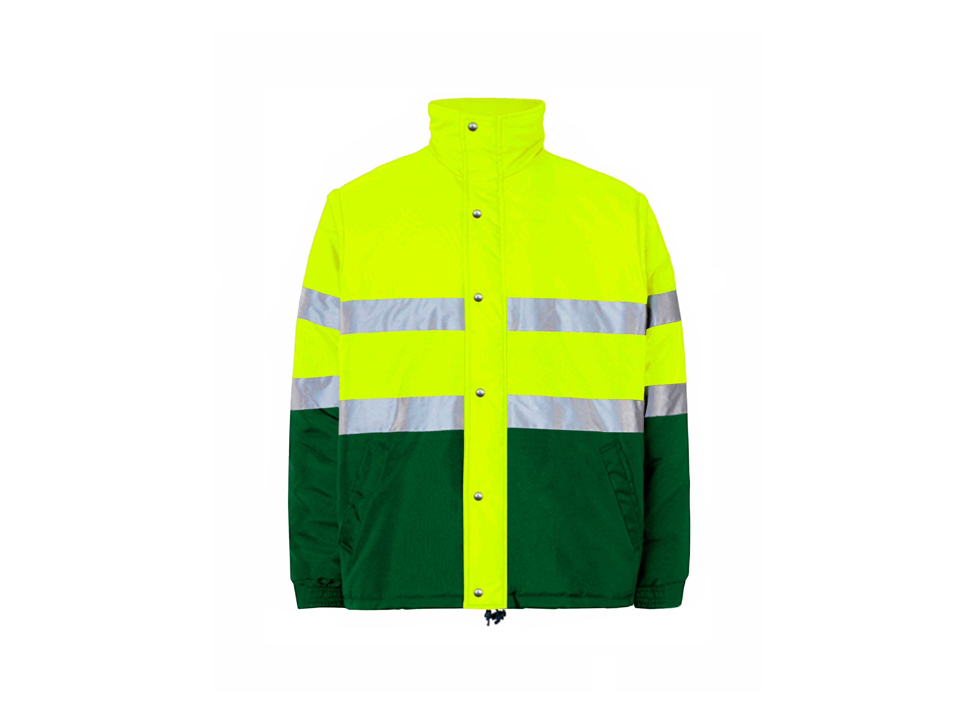 Class II bicolour padded waterproof canvas short parka detechable sleeves, central hidden zip, 2 lower slit pockets, 1 inside patch pocket with velcro. Double cuff. Hidden hood in collar. 2 reflective stripes on body and sleeves.