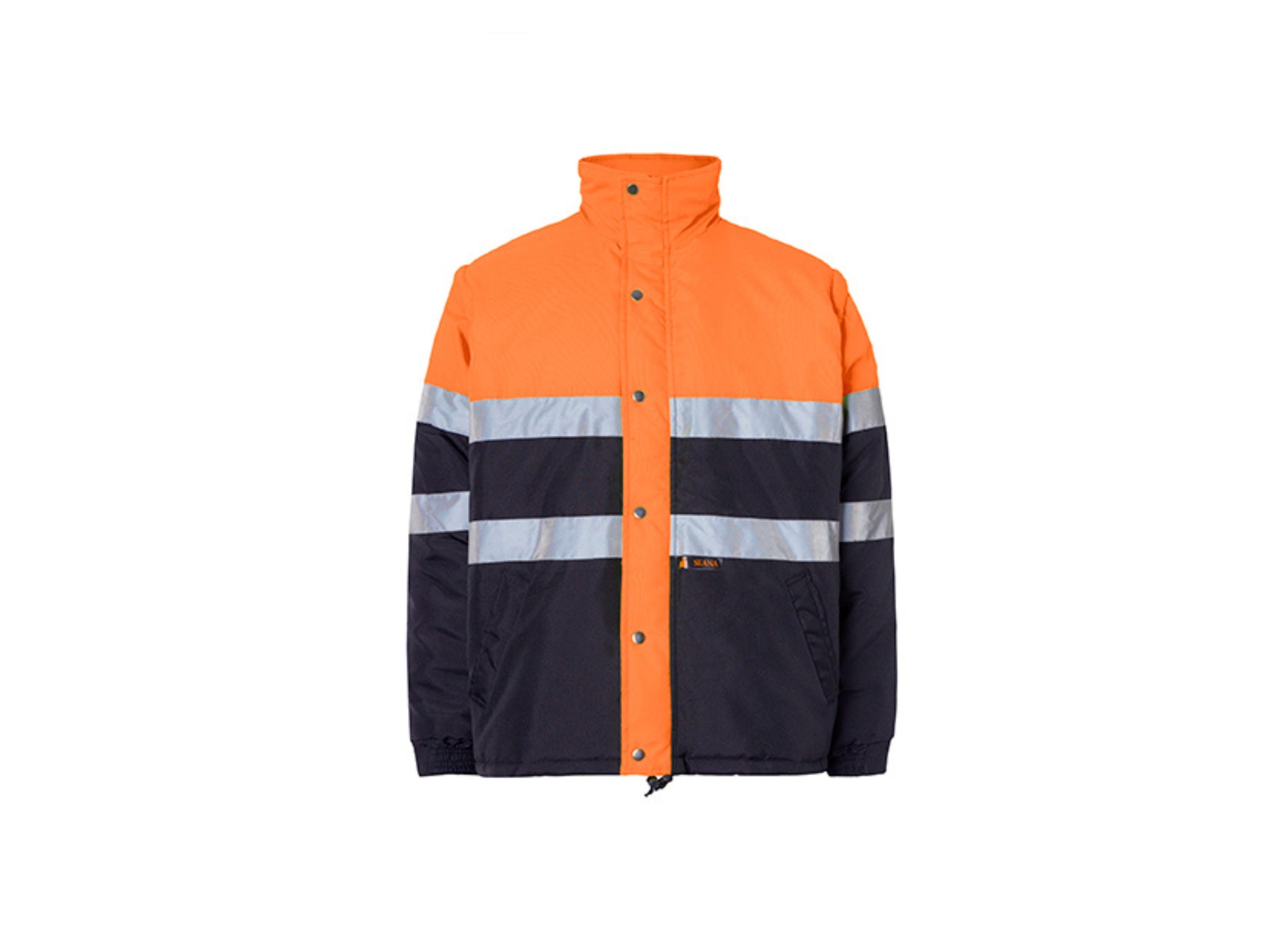 Parka corta loneta impermeable acolchada bicolor clase II mangas desmontables, cierre cremallera central con tapeta, 2 bolsillos inferiores cortados, 1 bolsillo interior de parche con velcro. Doble puño. Cuello capucha oculta. 2 bandas reflectantes en torso y mangas.