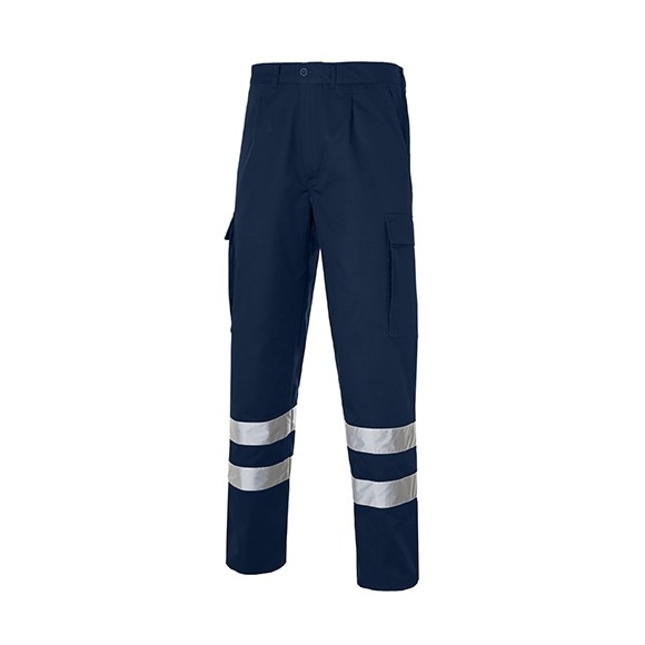Trousers 1/2 elastic waist at back, 2 front slant pockets,watch pocket, 1 back patch pocket with clip button, 2 side bellow patch pocket with Velcro flap on each leg. Lined with smooth flannel 100% cotton twill 150gr. Lining in the same fabric. 2 Reflective strip.