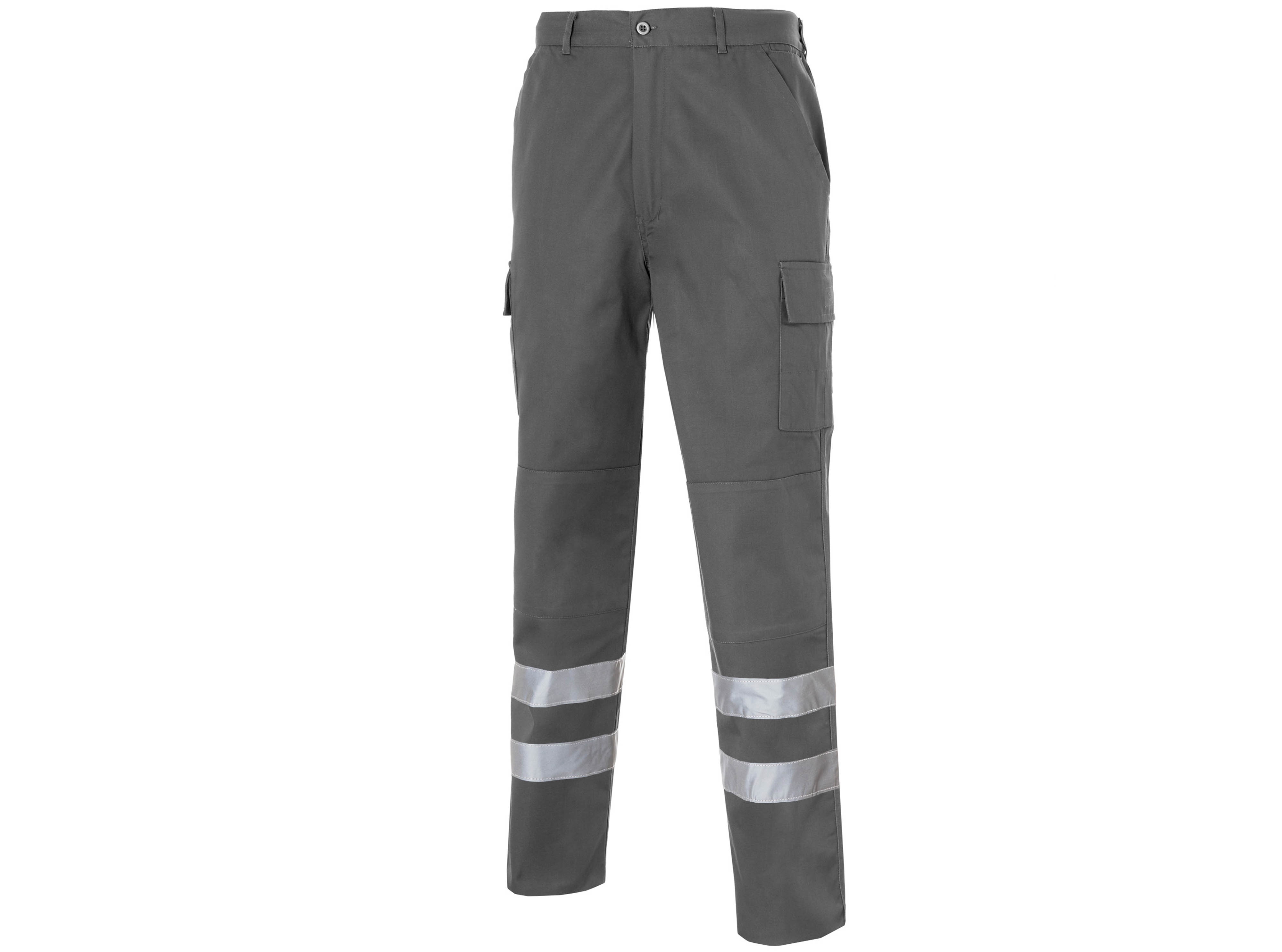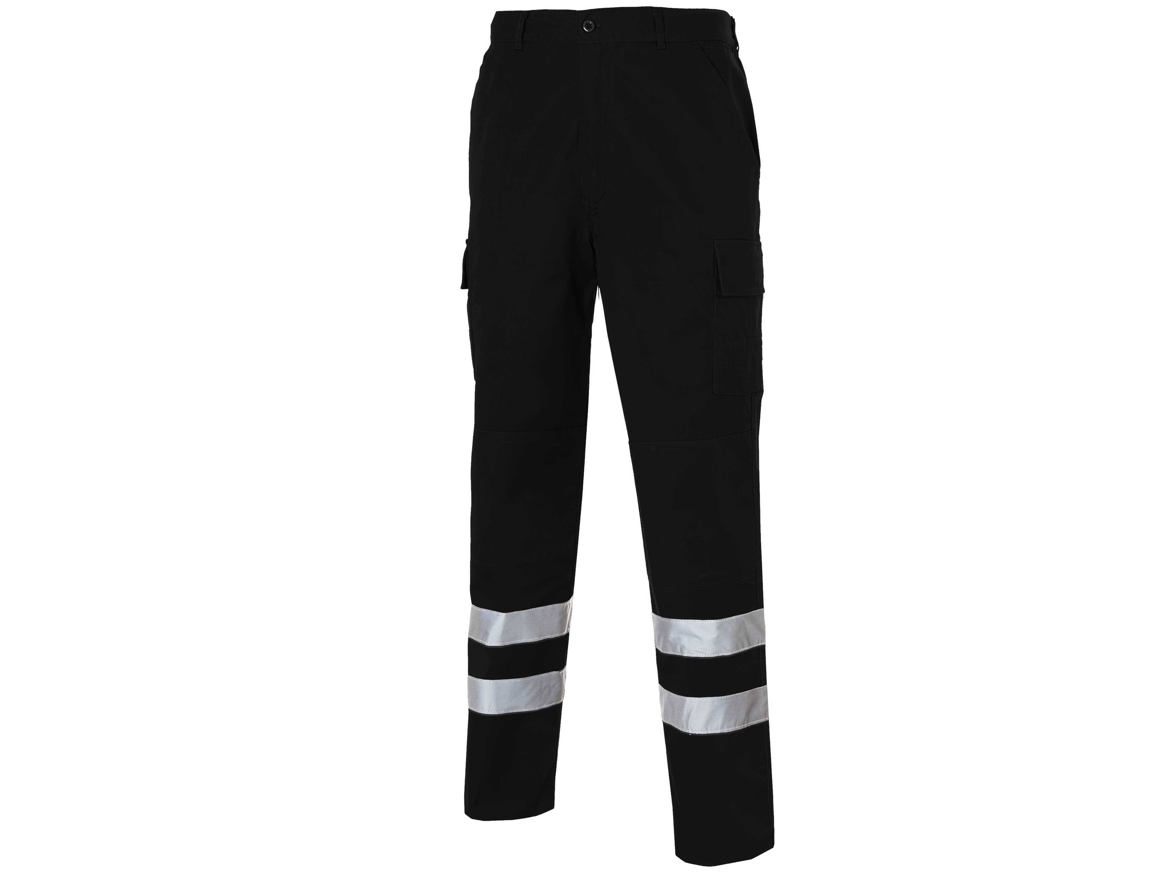 Trousers with elastic waist at side, 2 front slant pockets, watch pocket, 1 back patch pocket with flap and clip button, 2 side bellow patch pocket with Velcro flap on each leg. Lining in the same fabric. Reinforcement in seat and knees. 2 reflective stripes