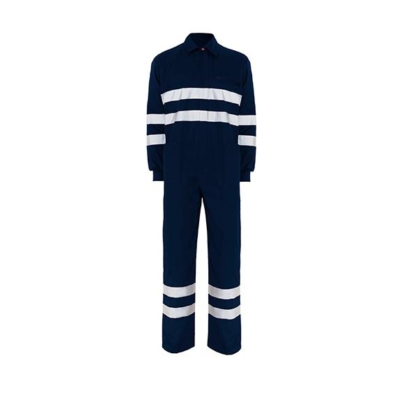 Overall with central covered zip., 1 chest pocket with zip and zip cover, 2 lower patch pockets and 1 back patch pocket, elastic waistband back and elastic cuffs. 2 reflective stripes on body, sleeves and legs.