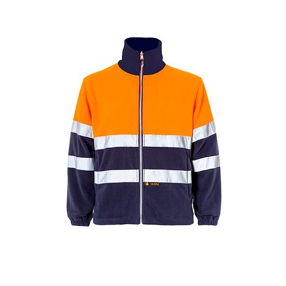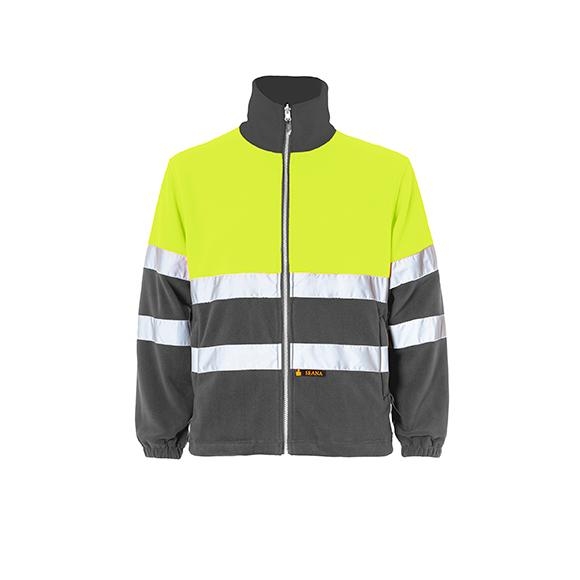 Class II bicolour polar jacket central zip, 2 side slit pockets with zip, girdle at the waist, elastics cuffs. 2 reflective stripes on body and sleeves.