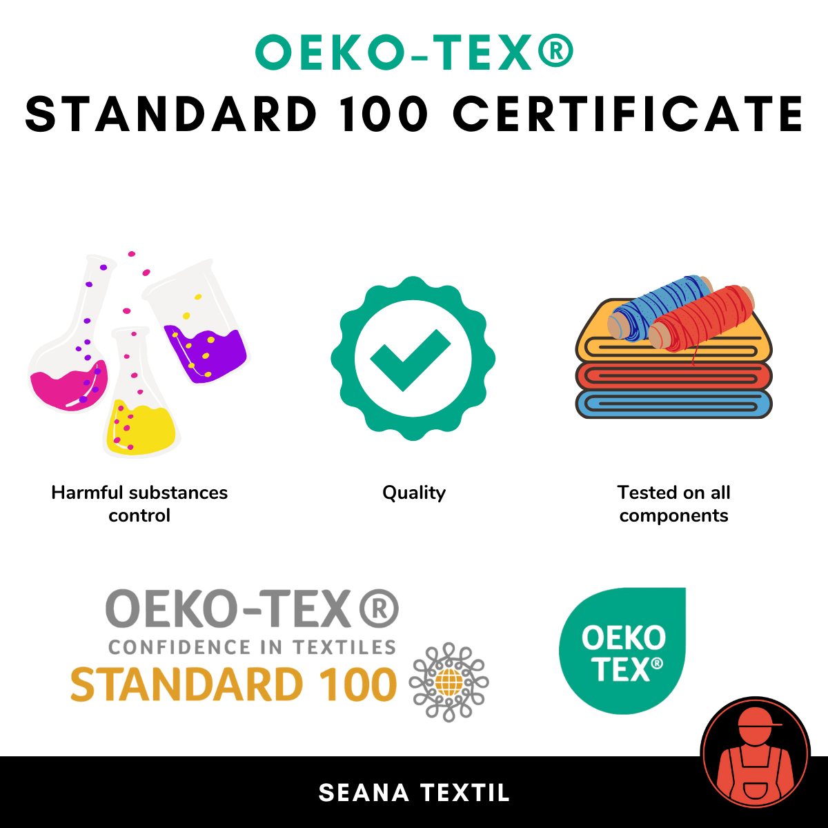 En Seana Textil contamos con la certificación de calidad Standard 100 de Oeko-tex. Esta consiste en un sistema de pruebas y verificación independiente y homogéneo en todo el mundo para productos textiles (incluidos los materiales y accesorios utilizados) para el control de sustancias nocivas .