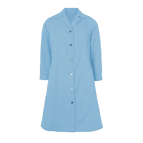 Bata señora manga larga, cuello solapa, 3 bolsillos de parche delanteros, 1/2 cinturón espalda, pinzas delanteras. Puño ojal y botón.