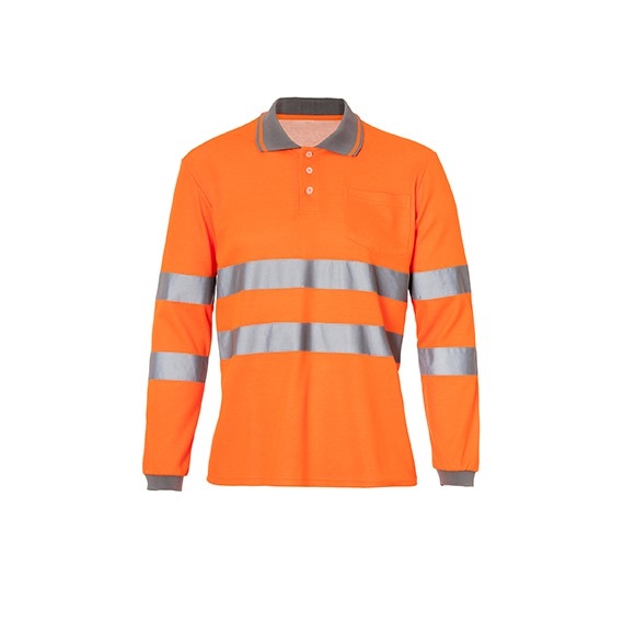 Polo calado monocolor manga larga, doble cara, 1 bolsillo con velcro en pecho, cuello contraste, transpirable en sisa, puño elástico. 2 bandas reflectantes en torso y mangas.