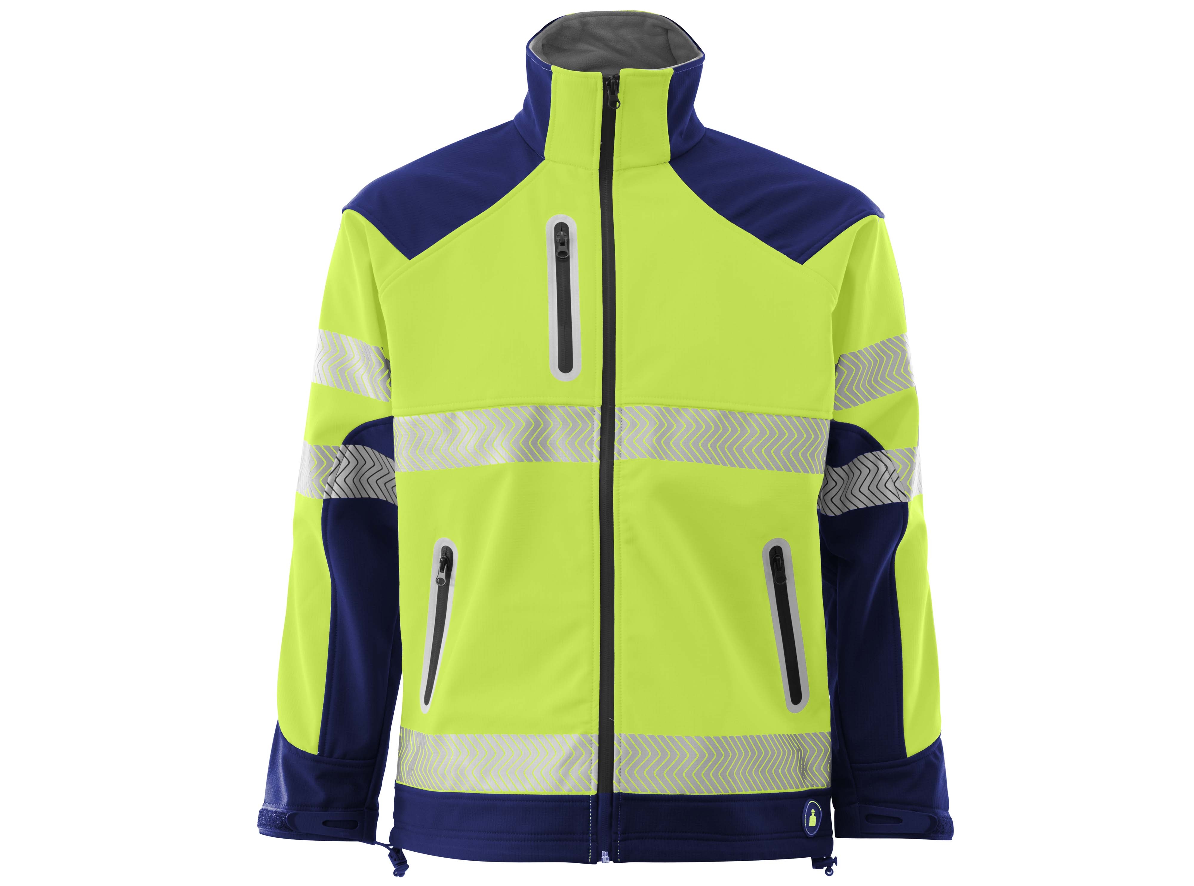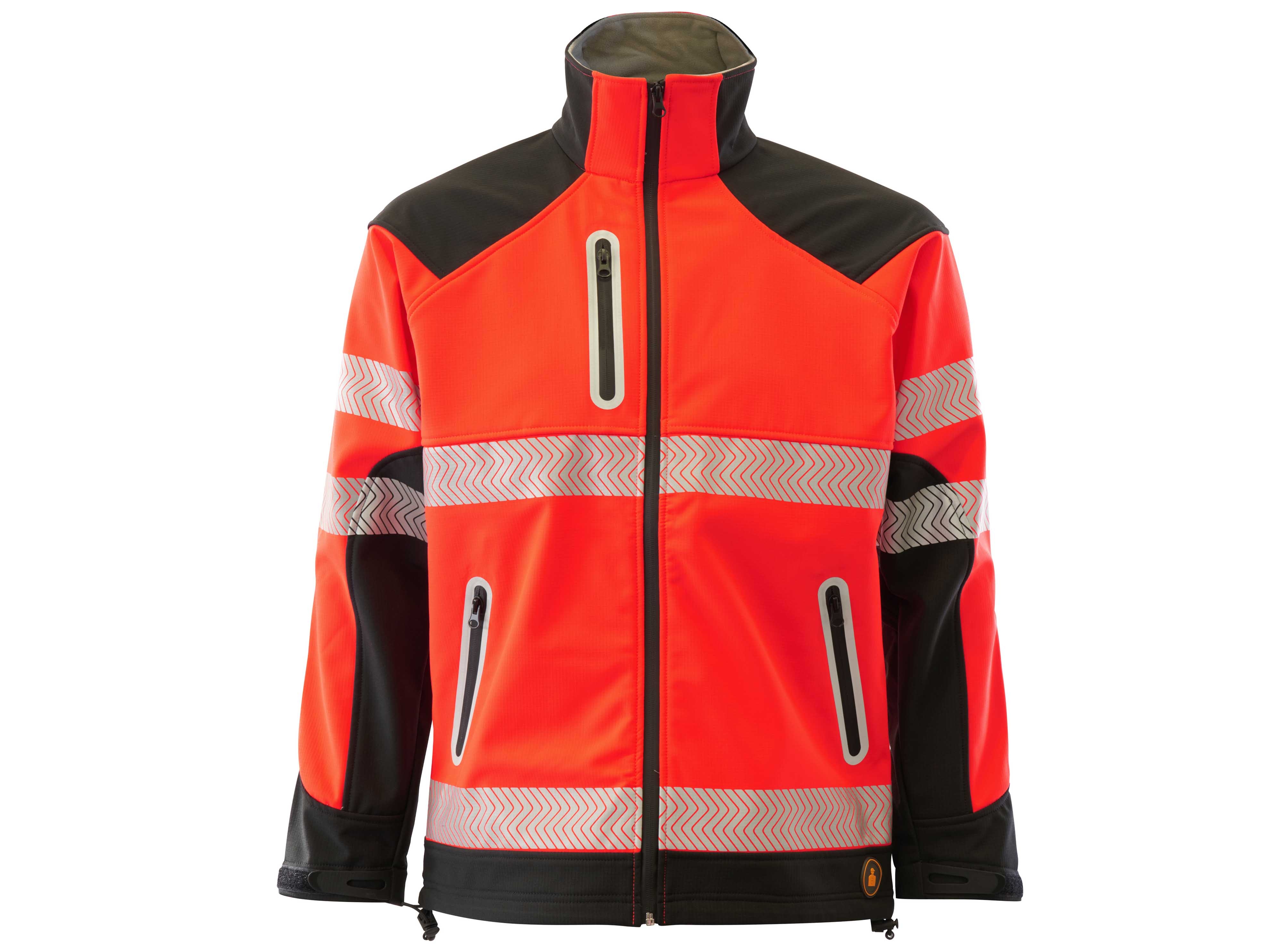 Chaqueta Softshell bicolor. Tejido Ripstop Pongee. Cremallera central impermeabilizada, 1 bolsillo superior con vivo reflectante y cremallera impermeabilizada, 2 bolsillos inferiores con cremallera impermeabilizada y vivos reflectantes, puño ajustable con velcro. 2 bandas reflectantes termoselladas discontinuas en torso y mangas