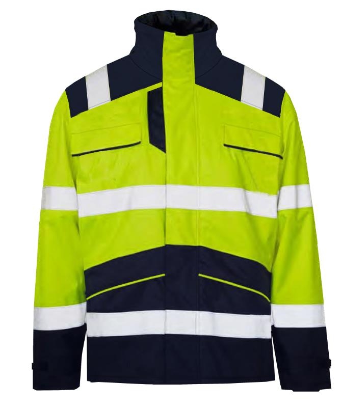 Parka ig-atex alta visibilidad. Cierre central con tapeta y velcro, 2 bolsillos superiores, cuello con capucha oculta. Chaleco polar interior ignífugo. 2 bandas reflectantes ignífugas en torso y mangas. 2 bandas reflectantes ignífugas en canesú.
