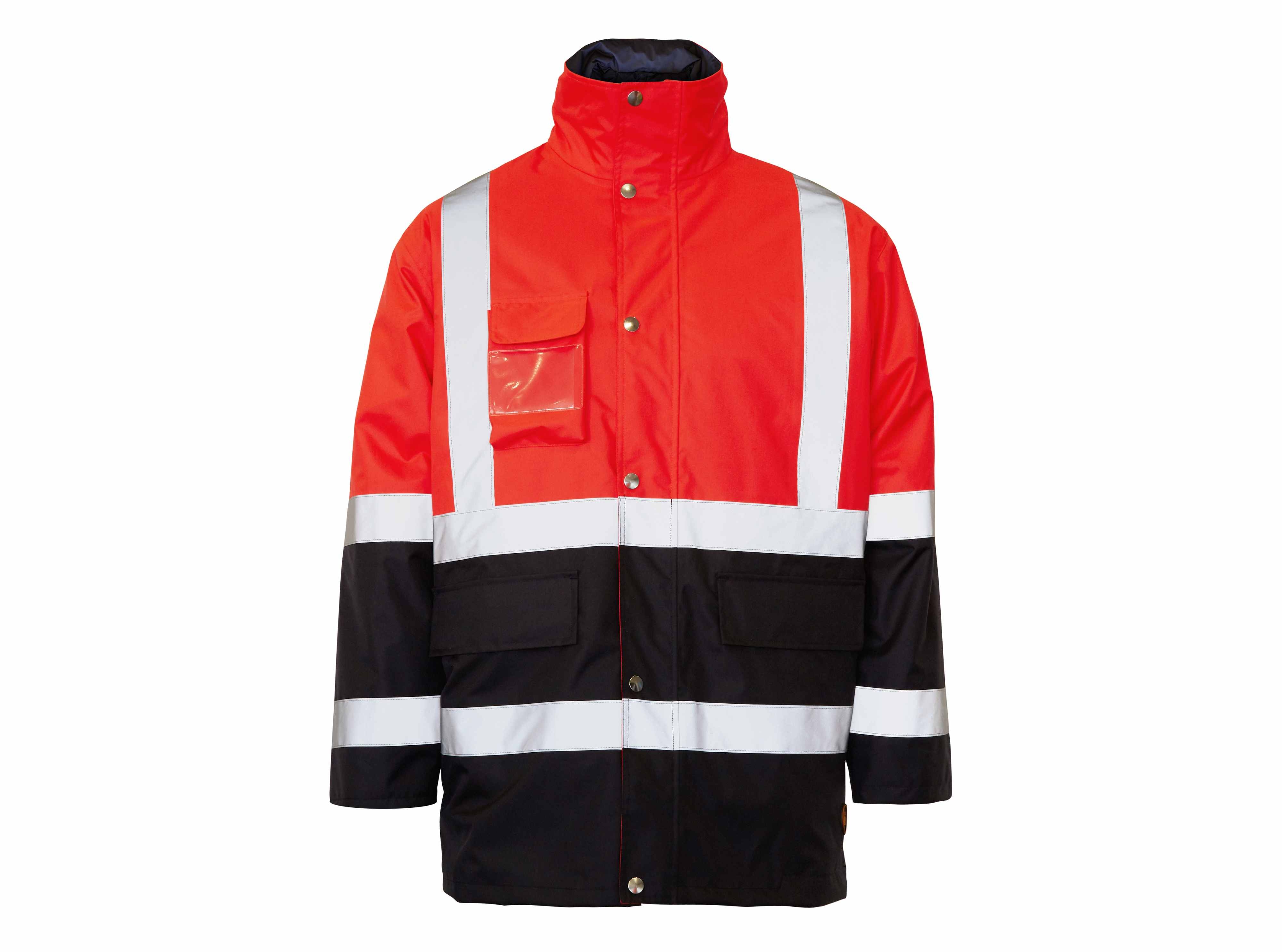 Parka loneta impermeable acolchada bicolor clase II, cierre cremallera central con tapeta y clip, 1 bolsillo tarjetero en pecho, 2 bolsillos cortados inferiores con tapeta, 1 bolsillo interior, puño elástico oculto, cuello con capucha oculta, respiradero en sisa. 2 bandas reflectantes en torso y mangas y 2 bandas tirantes. 300 dinner.