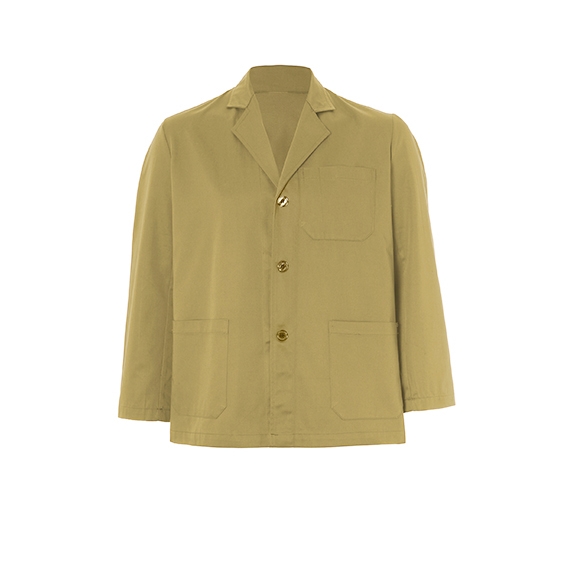 Sahariana con cuello solapa, 3 bolsillos de parche delanteros y 2 aberturas espalda.