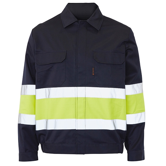 Cazadora con cierre de clip sopatado, 2 bolsillos superiores con cartera y velcro, puños con cierre de clip oculto, gomas en cintura, canesú trasero, con 2 bandas reflectantes ignífugas en torso y mangas.