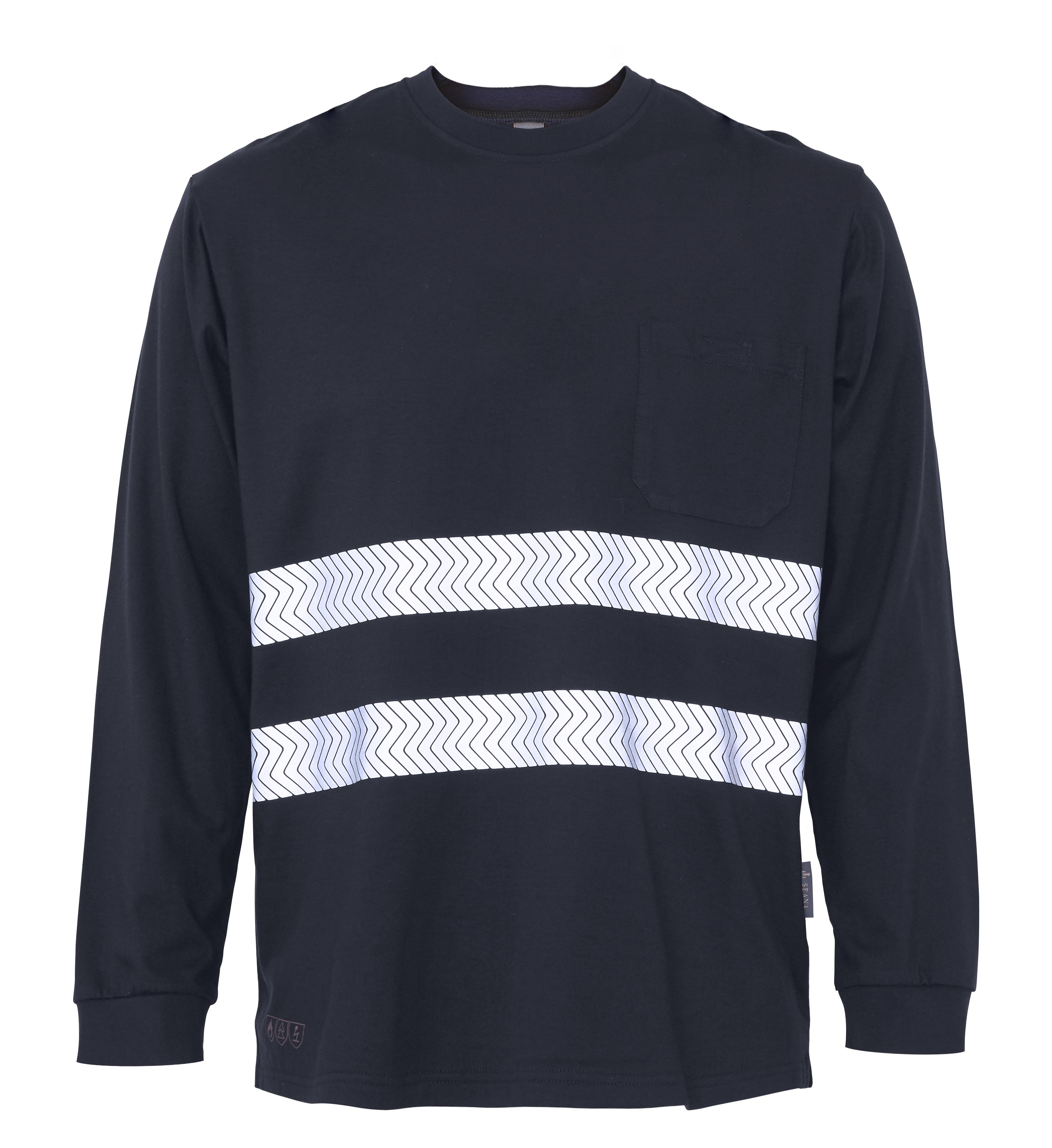 Camiseta manga larga punto liso, ignífuga-Atex. Cuello redondo. 1 bolsillo con velcro en pecho. Puños elásticos. 2 bandas reflectantes termoselladas discontinuas ignífugas en torso